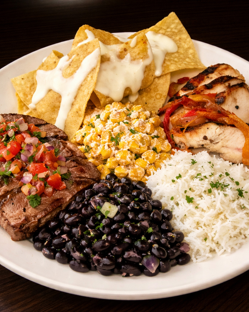 Creamy Elote, Cilantro Lime Rice, Vegetarian Black Beans, Chips with guac, pico, and cilantro crema